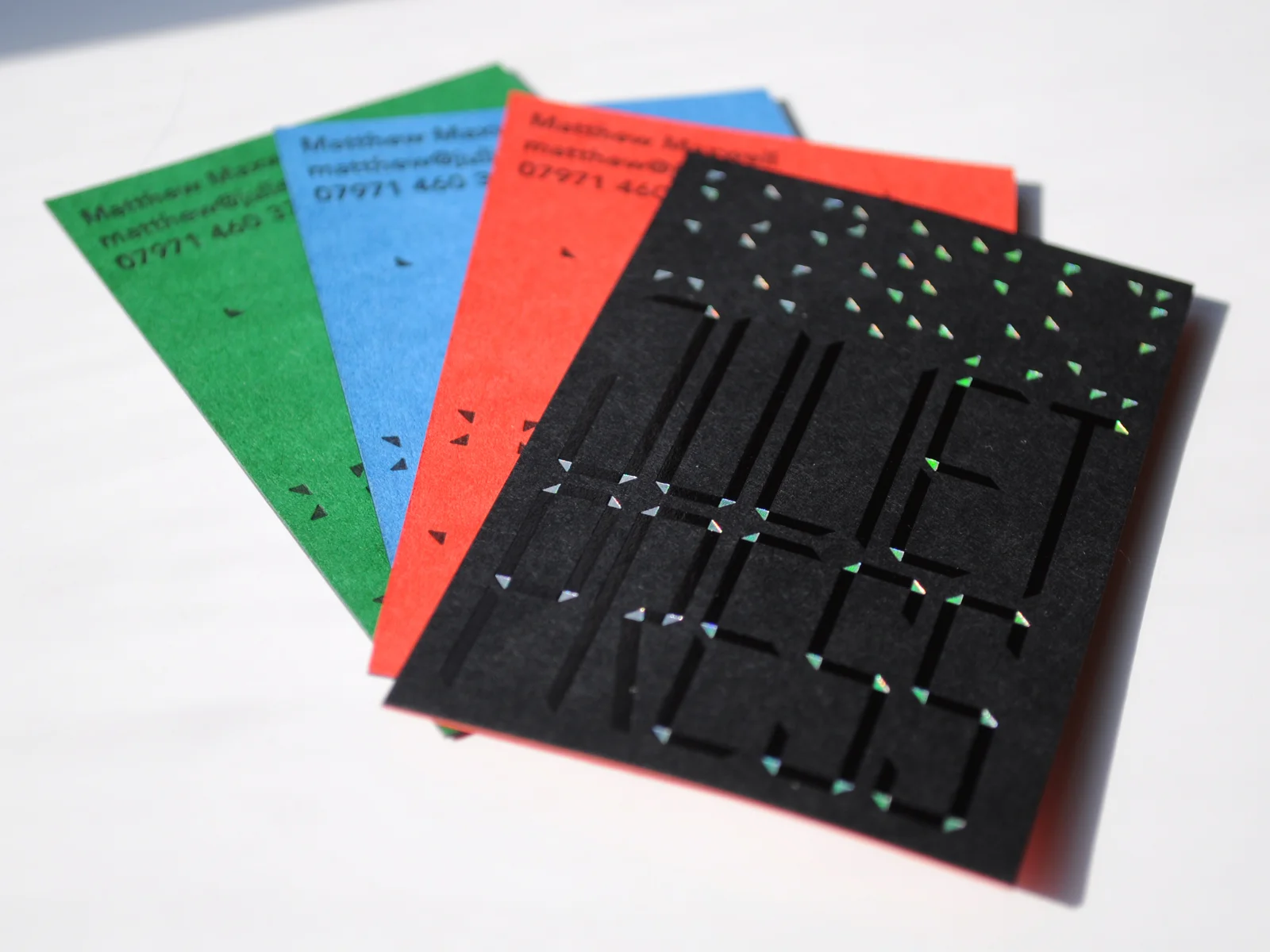 Cards are duplexed using 270gsm GF Smith Colourplan, with 3 colour variants. The front side (contact details) is printed letterpress while on the reverse side, the logo is foiled in gloss black and the highlights are foiled in a diffraction silver.